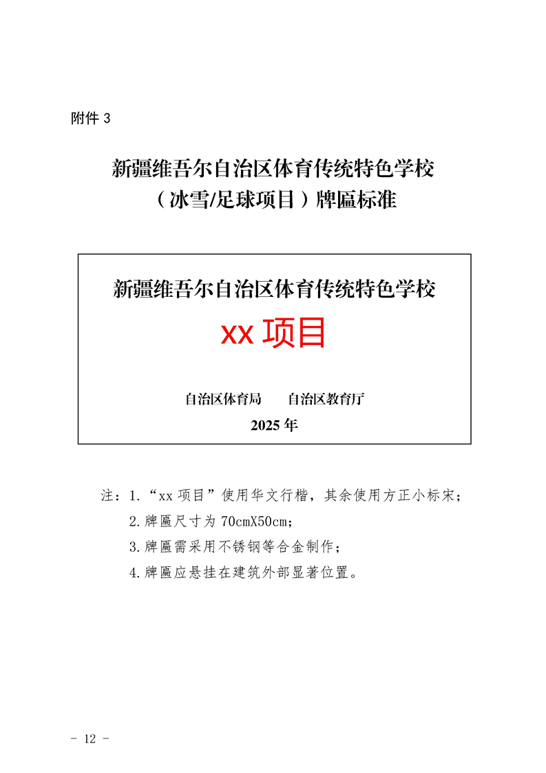 3. 新疆维吾尔自治区体育传统特色学校(足球/冰雪项目)牌匾标准