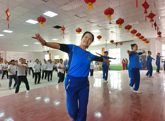 随着音乐响起,村民们跟着节奏慢慢舞动,在老师的反复指导和同伴的相互提醒下,大家的动作逐渐整齐。活动室里的笑声、音乐声与脚步声交织,原本宁静的乡村被活力填满。