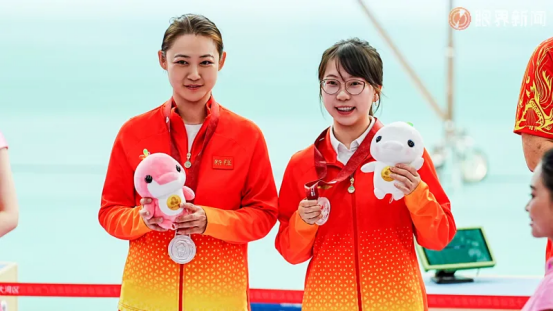 10月15日,第十五届全国运动会射击女子25米手枪决赛在广州举行,新疆选手陈佳捧回一枚银牌,创造新疆在该项目最好历史成绩。 图为:赛后陈佳(右)和她的教练张梦楚(左)合影留念。(图由新疆广播电视台记者 白冰 提供)