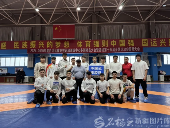 自治区重竞技运动训练中心的中国式摔跤训练馆内,中国式摔跤队员们合影。石榴云/新疆日报记者 王晶晶 摄