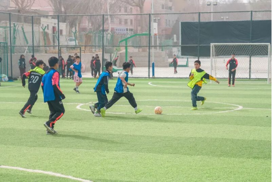 2月27日,孩子们正在和田市体育馆内的绿茵场上踢足球。伊尔番 摄