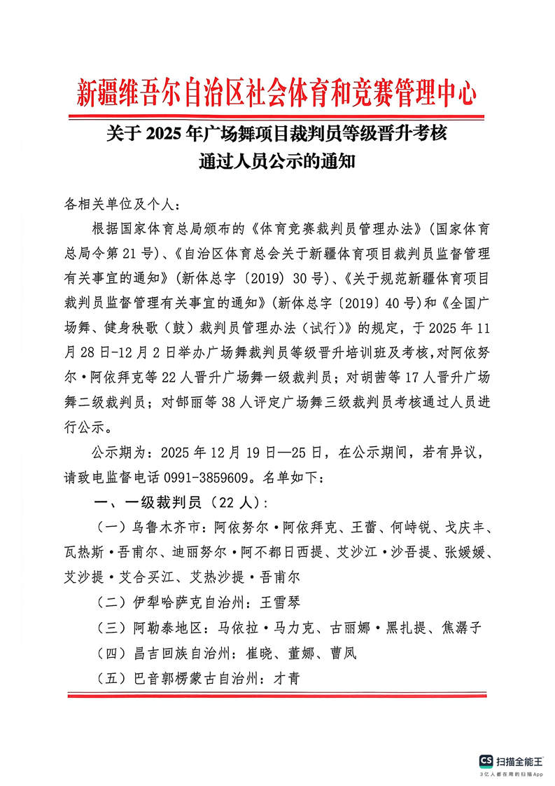 关于2025年广场舞项目裁判员等级晋升考核通过人员公示的通知
