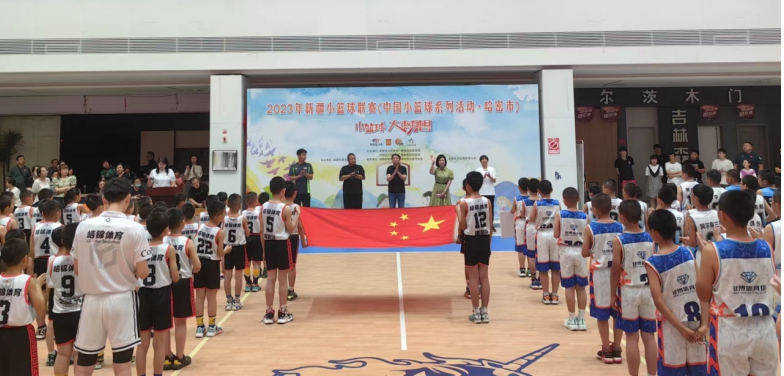 开幕式上,大家一起奏唱国歌。伊州区文体广旅局党组书记、副局长黄丹丹在致辞时说到:“本次活动旨在通过小篮球竞赛,引导更多孩子接触篮球运动,进一步增强少年儿童的身体素质,培养乐观向上、不断拼搏的精神。”