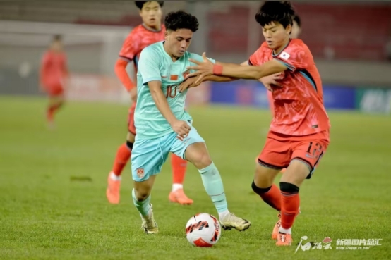 2024年10月27日晚,艾比布拉·努尔阿吉在U17亚洲杯预选赛对阵韩国队比赛中。买尔旦·热合曼提供