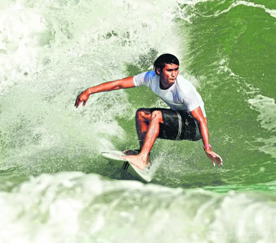 11月14日,第十五届全国运动会冲浪男子短板比赛,新疆队选手黄云翁在比赛中。
