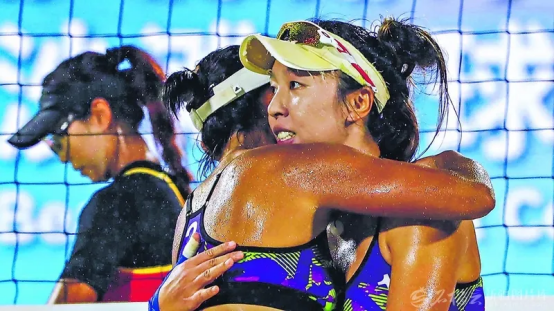 11月6日,第十五届全国运动会香港维多利亚公园沙滩排球比赛现场,新疆队选手王婧哲(右)与夏欣怡相拥鼓励。