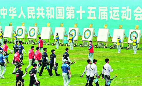 11月15日,第十五届全国运动会射箭比赛现场,运动员走向靶位查看成绩。