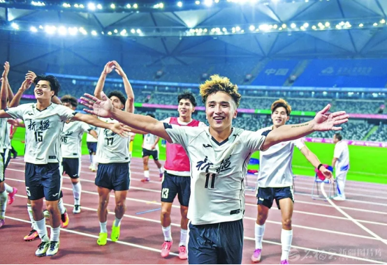 11月3日,第十五届全国运动会足球U20男子小组赛第二轮,新疆队以1:0战胜浙江队后,球员庆祝胜利。