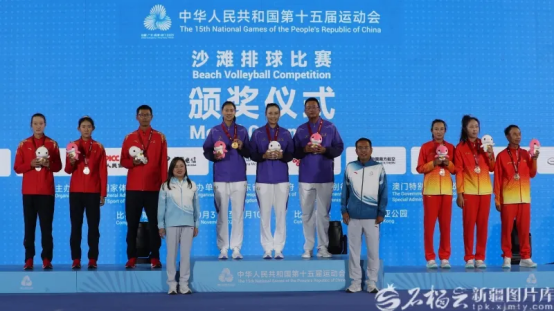 11月8日,第十五届全国运动会沙滩排球比赛颁奖仪式现场。