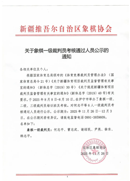 关于象棋一级裁判员考核通过人员公示的通知