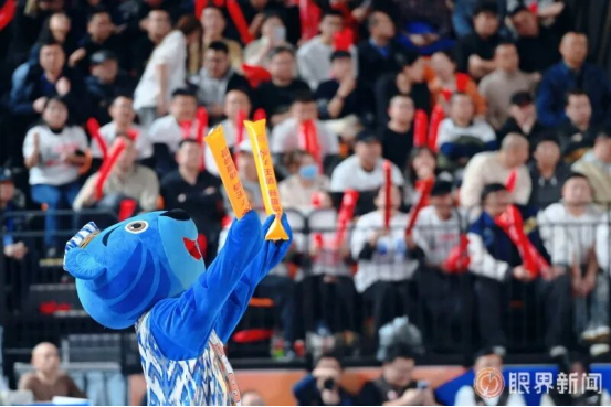 1月25日,在五一新区文体中心,吉祥物小飞正在带领球迷为新疆男篮球员加油助威。记者 陈岩 摄