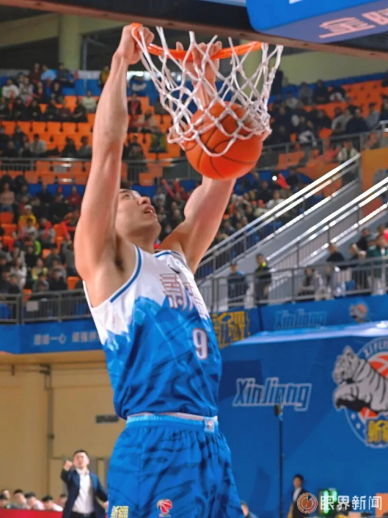 1月25日,在五一新区文体中心,新疆男篮队员吴冠希前场突破扣篮。记者 陈岩 摄