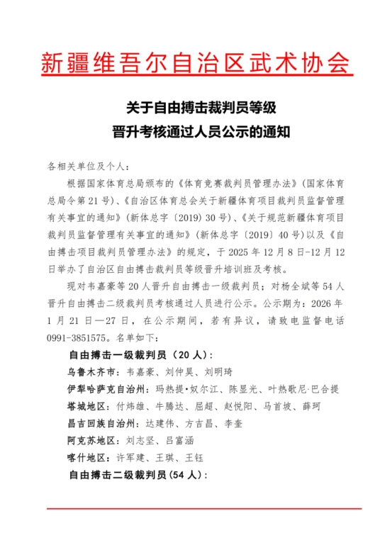 关于自由搏击裁判员等级晋升考核通过人员公示的通知