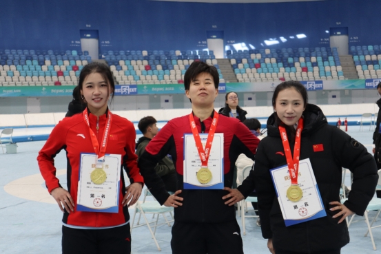 在2025-2026赛季全国速度滑冰冠军赛女子短距离团体追逐赛中,新疆队捧回金牌。赛后,队员们合影留念。左:王莹莹、中:田芮宁、右:奚冬雪。