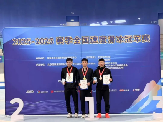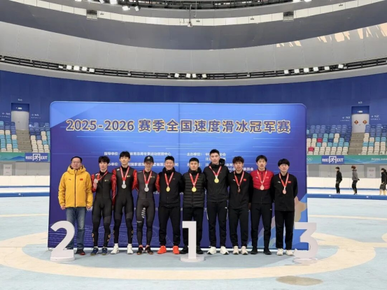 在2025-2026赛季全国速度滑冰冠军赛男子短距离团体追逐赛中,新疆队捧回金牌。赛后,队员们合影留念。左:梁志豪,中:薛智文,右:邓智瀚。