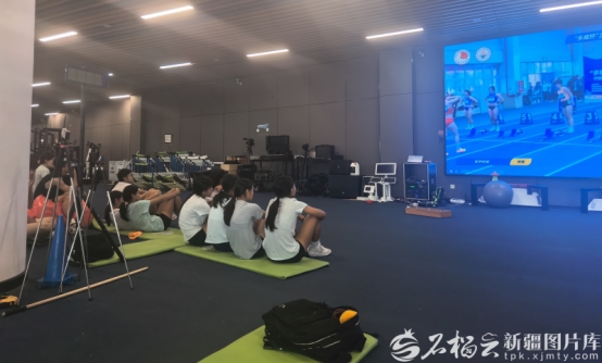 在昌吉州第一中学室内田径馆,队员们集体观看李艳杰的比赛。韩超 摄